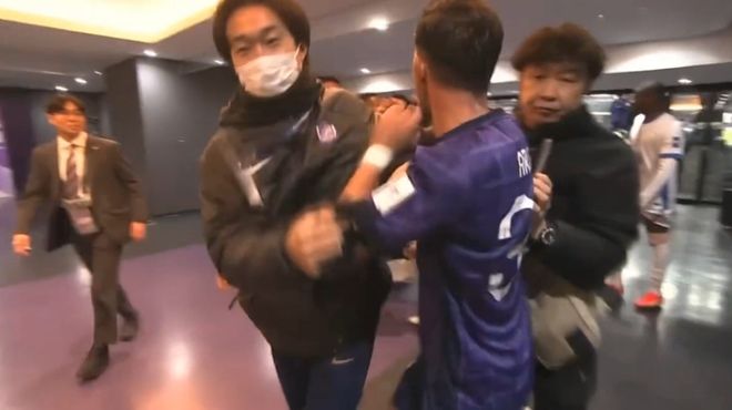 球场不是对手,场下反而我们不怵他们。这场比赛的中场休息时间,在球员通道里双方队员突然发生了一次冲突。原来当双方球员走回更衣室的时候,对方外援阿尔斯兰走着走着,猛然回头往回找。当他看到高天意的时候,一把揪住后者的胳膊说着什么。高天意没有说话,就这样互相纠缠着(上图)。